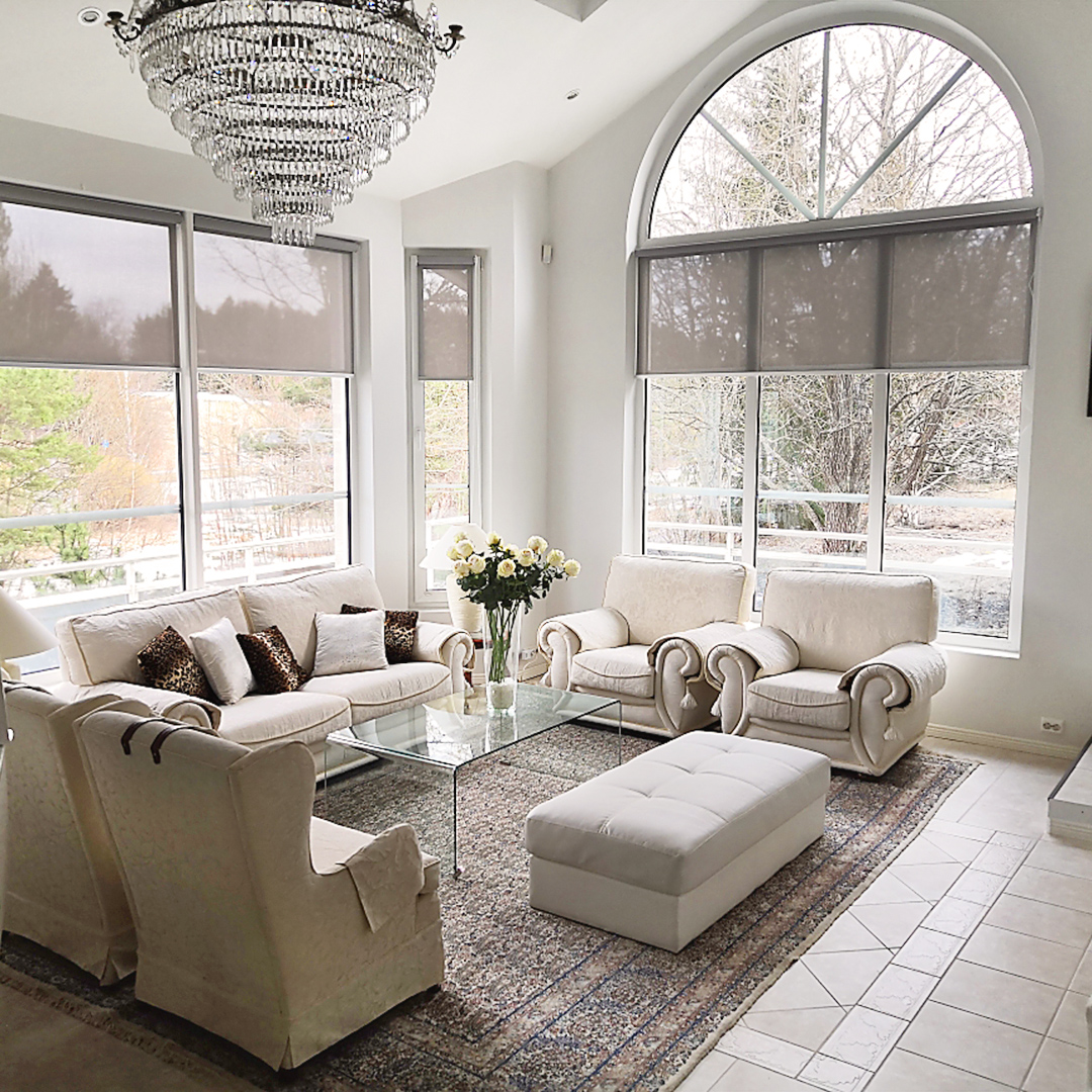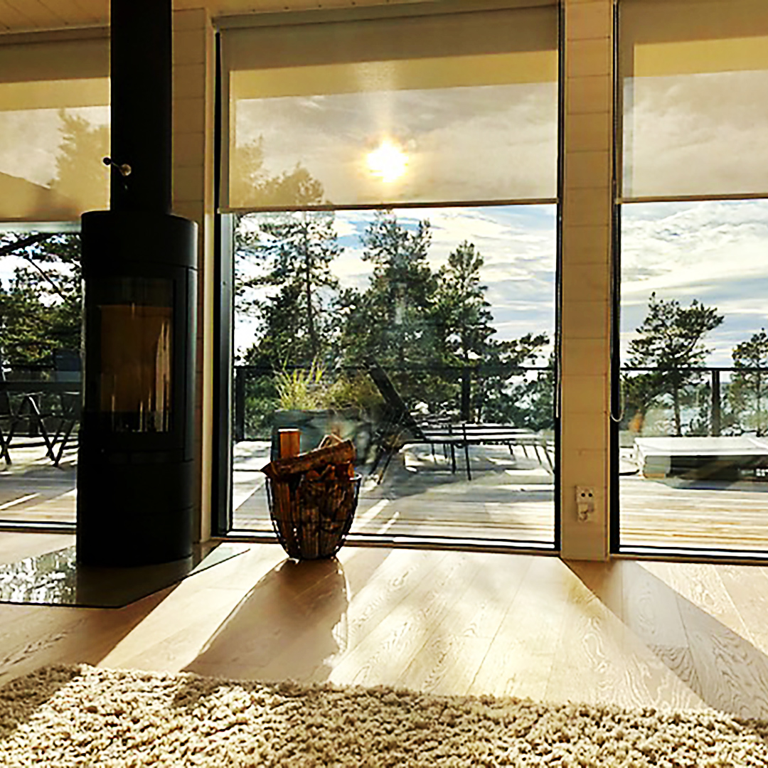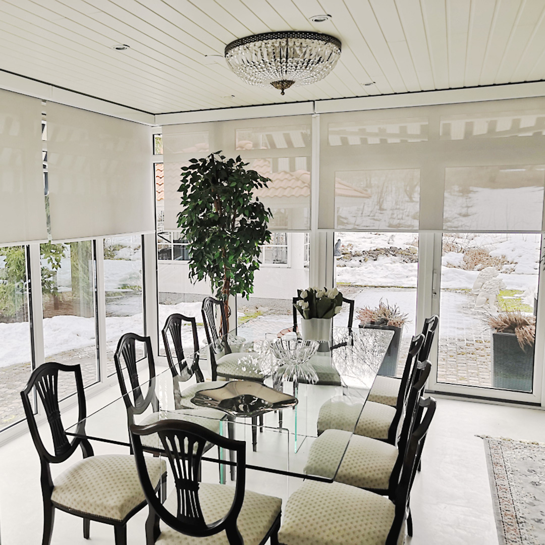 Säädettävä valonhallinta: screen-kankaat antavat näkymän ulos mutta torjuvat lämpöä, pimentävät kankaat puolestaan sulkevat valon täysin.